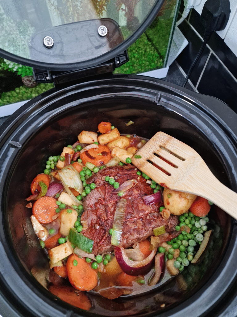- Use Budget Cuts: Stew meat or chuck roast works best — lean cuts can become tough in the slow cooker.