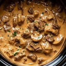 - Step 2: Build the Flavor Base. In the slow cooker basin, combine the dry onion soup mix, beef broth, cream of mushroom soup, and minced garlic. Whisk or stir well until everything is evenly combined. This creates the flavorful base that will slowly transform into a rich stroganoff sauce.